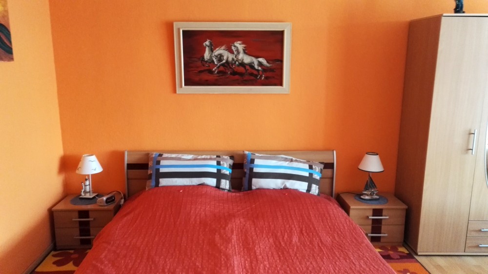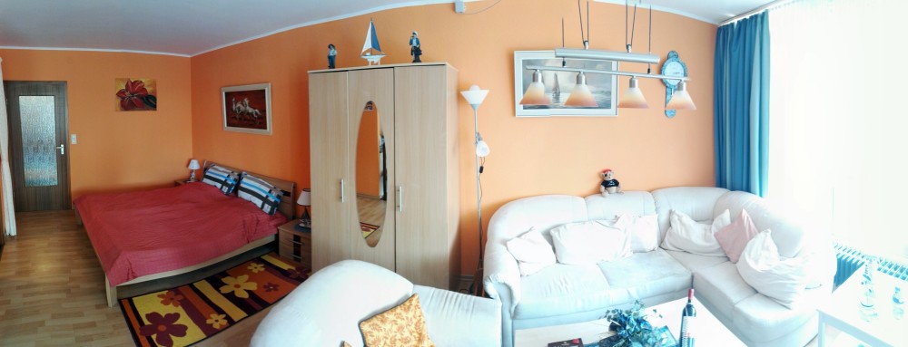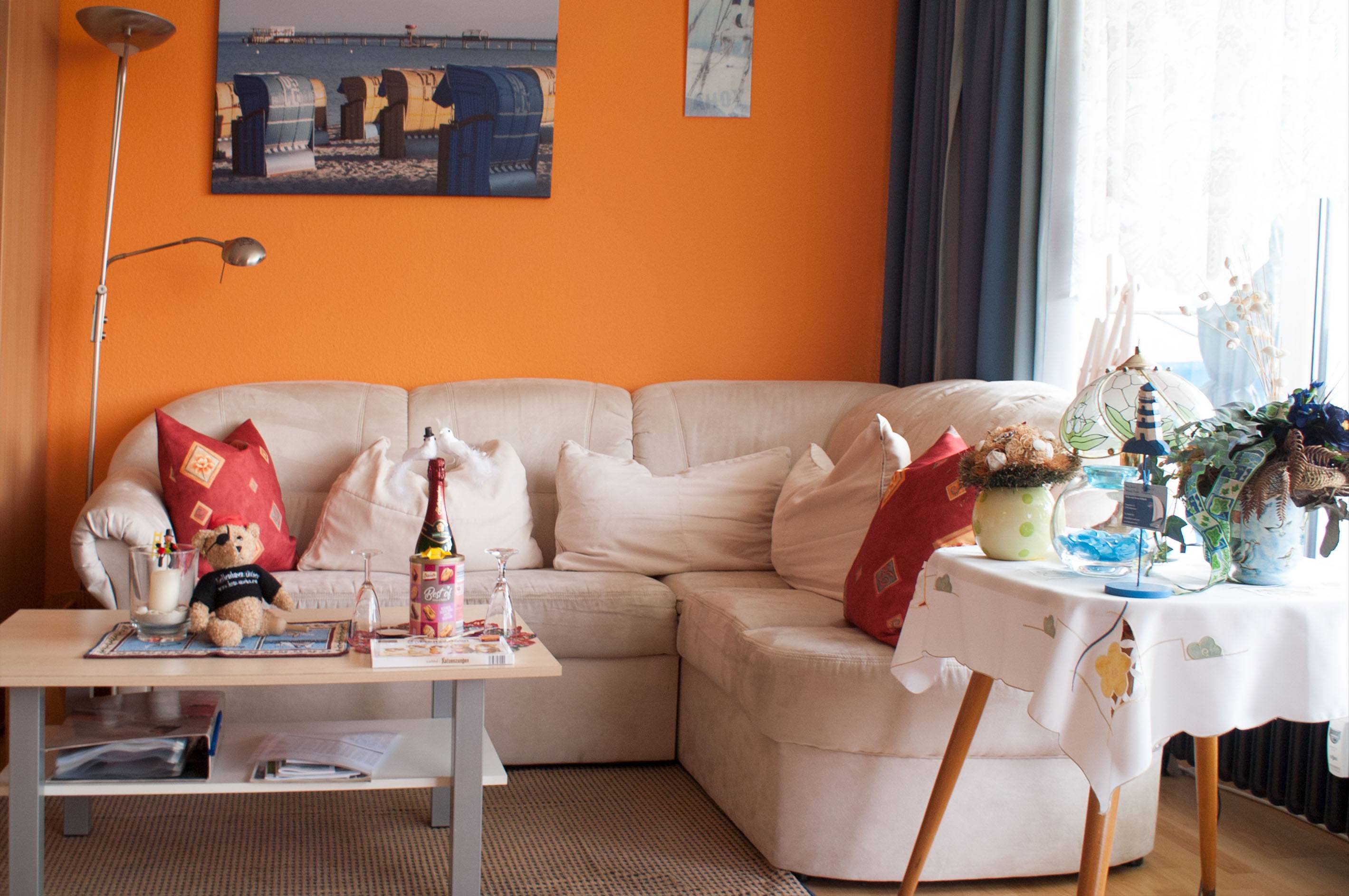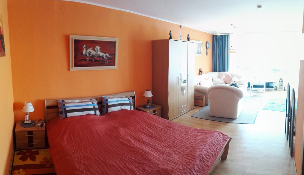 Der große Wohn- Schlafraum besteht aus einem Ehebett (1,80 x 2,00m), einer gemütlichen Sitzecke und einem Wohnzimmerschrank.