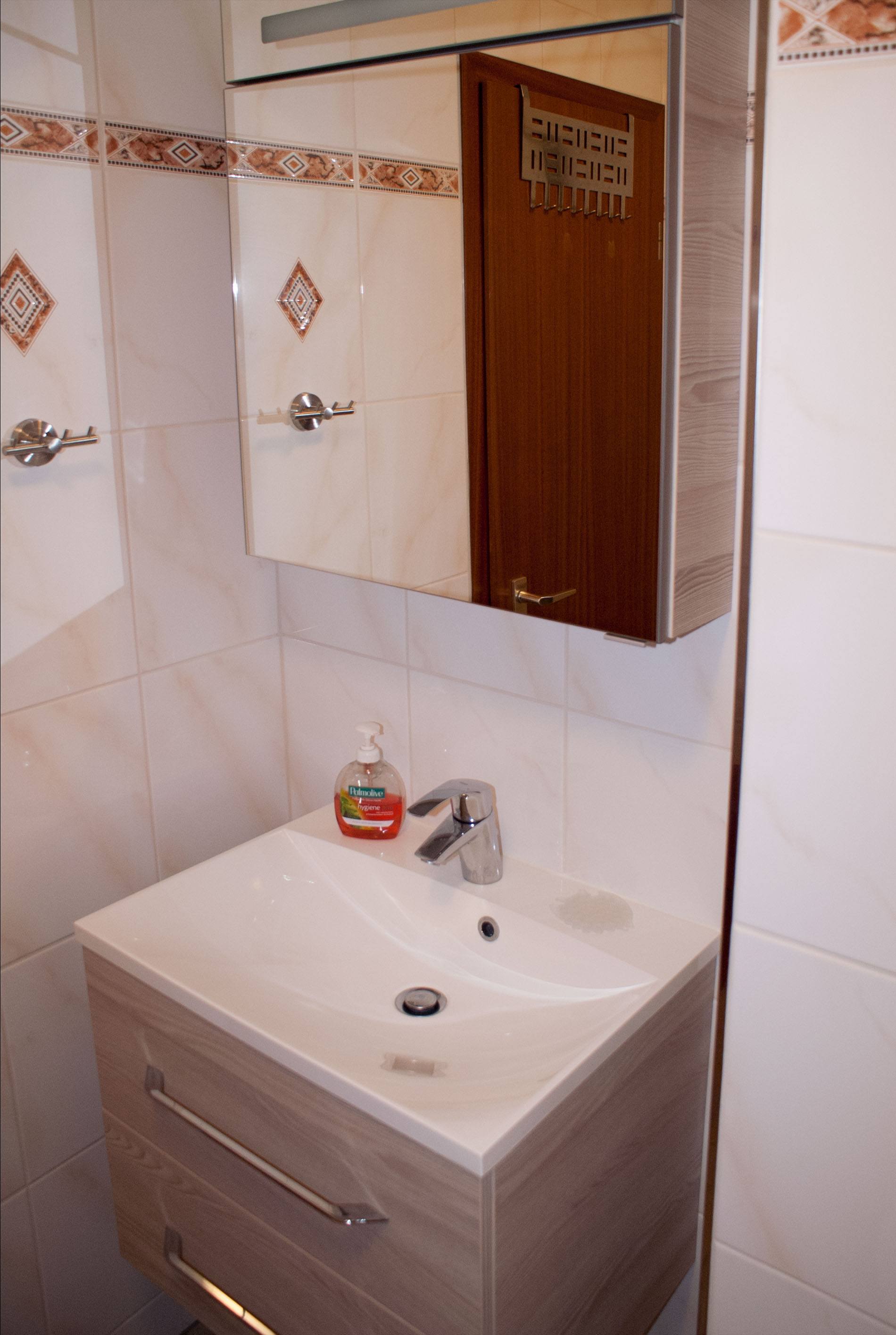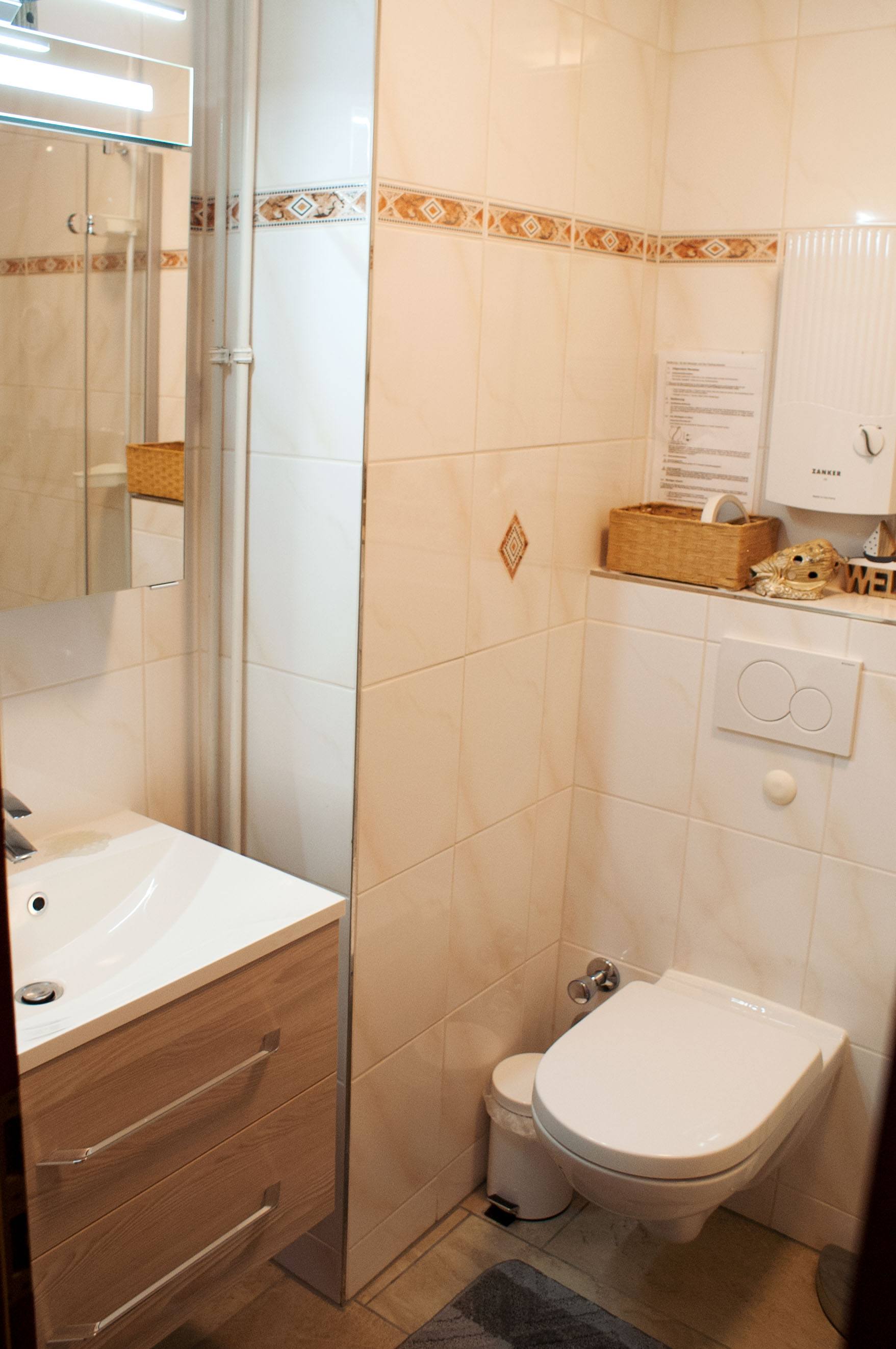 Das Bad ist mit einer Wanne und Duschgelegenheit versehen.