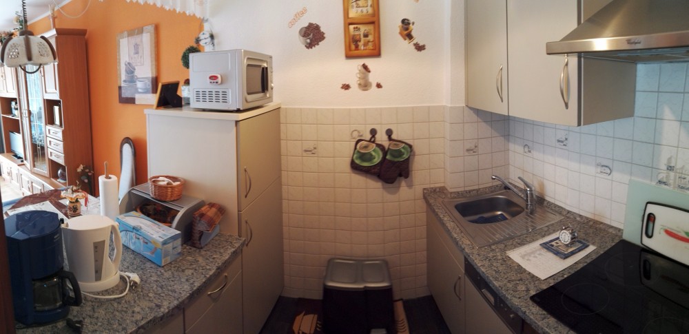 Die Einbauküche ist mit einem Kombi Herd, Kühlschrank, einem kleinen Gefrierschrank. Geschirrspühler und Schränken ausgestattet