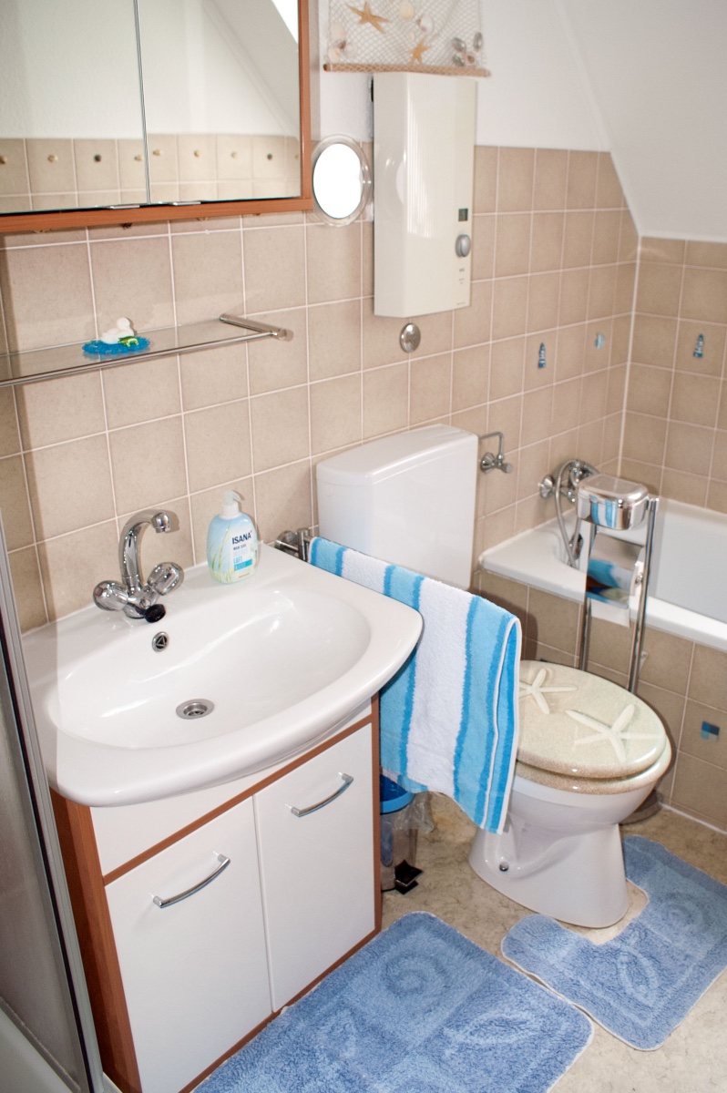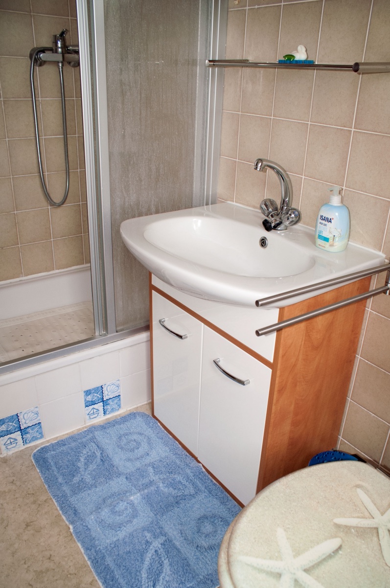 Das Bad ist mit Badewanne (zum relaxen oder für das Baden von 1 oder 2 Kindern) wie einer Duschkabine ausgestattet. Ein Waschbecken (60 cm) und ein WC (mit Spartaste), sowie Waage und Wäschetrommel sind in einem nicht zu kleinen Bad untergebracht.
