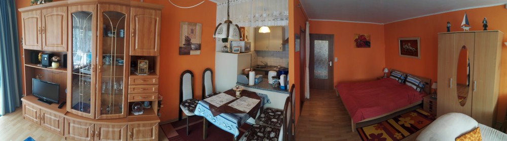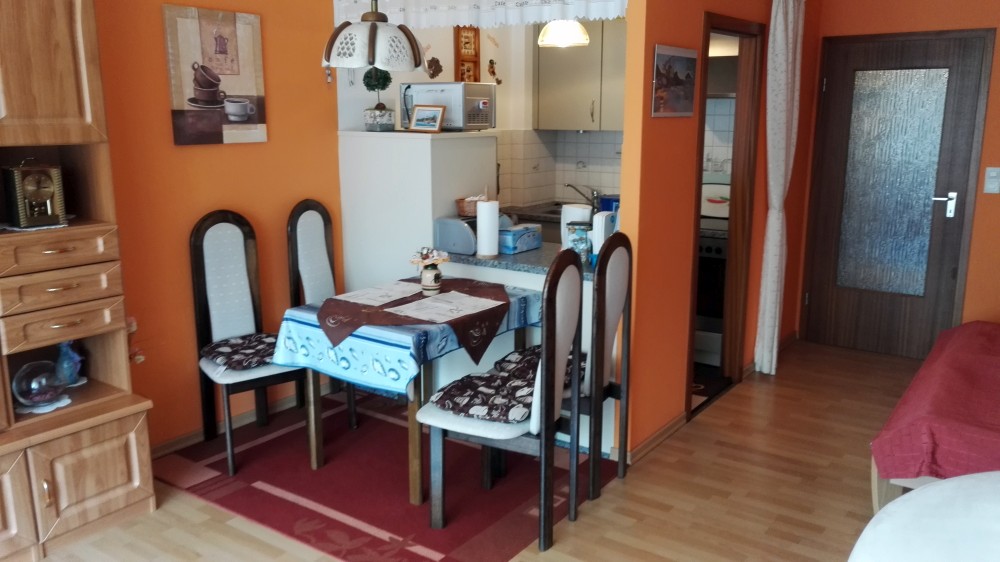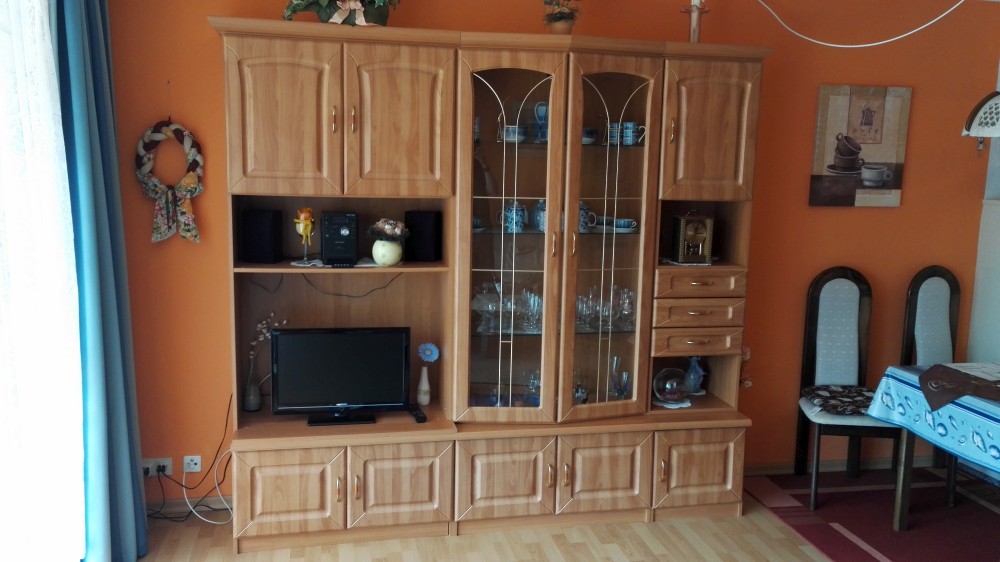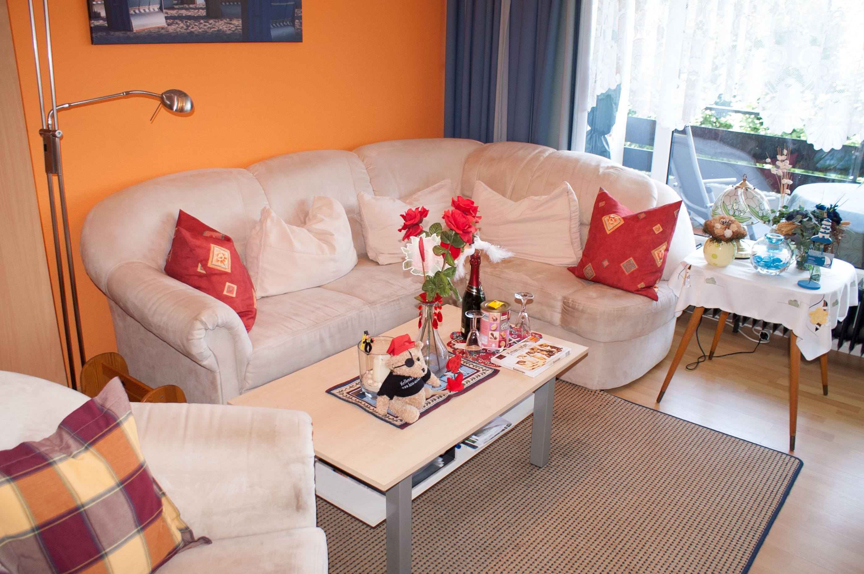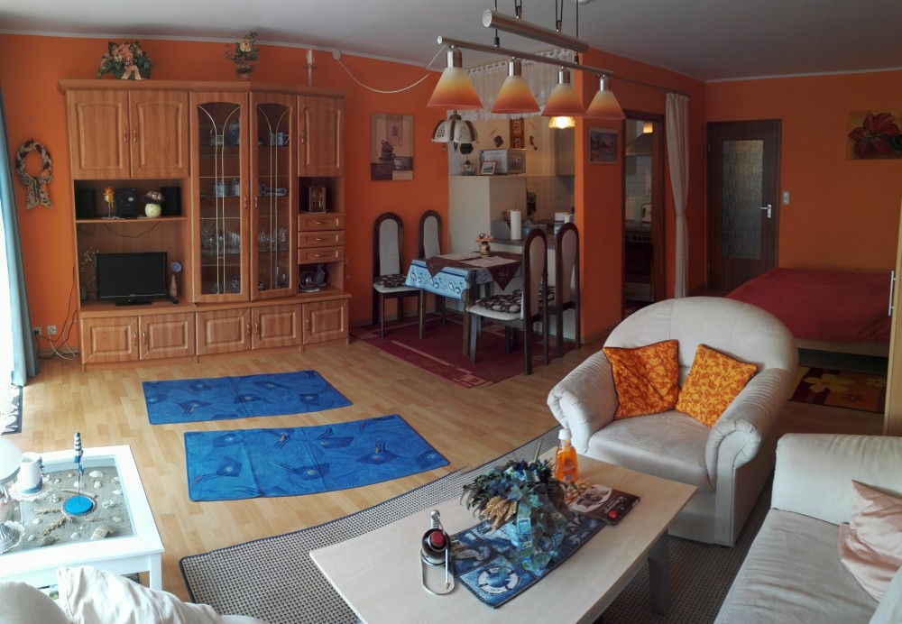 Der große Wohn- Schlafraum besteht aus einem Ehebett (1,80 x 2,00m), einer gemütlichen Sitzecke und einem Wohnzimmerschrank.